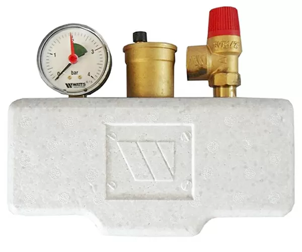 Группа безопасности котла KSG 30/25M предназначена для защиты закрытых систем отопления от избыточного давления и завоздушивания. Включает в себя предохранительный клапан, автоматический воздухоотводчик (с запорным клапаном) и манометр, смонтированные на стальной консоли в теплоизоляции.